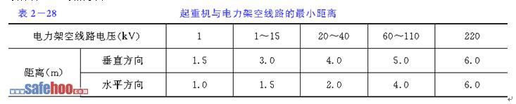 ??????? (4) 現(xiàn)場(chǎng)應(yīng)無(wú)障礙物,現(xiàn)場(chǎng)及其附近有電力架空線路時(shí),確認(rèn)運(yùn)輸機(jī)械與電力架空線路的最小距離必須符合2-28表的要求。