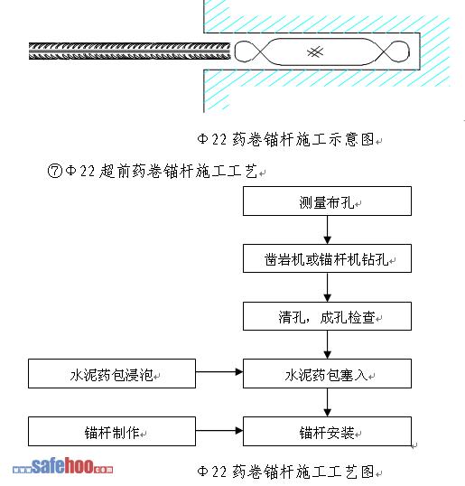 ①Ф22藥卷錨桿建用早強(qiáng)砂漿作為粘接材料,尾部焊接在鋼拱架上。錨桿將根據(jù)設(shè)計(jì)圖現(xiàn)場制做,按設(shè)計(jì)布置鉆孔,用高壓風(fēng)將孔內(nèi)雜物吹凈。