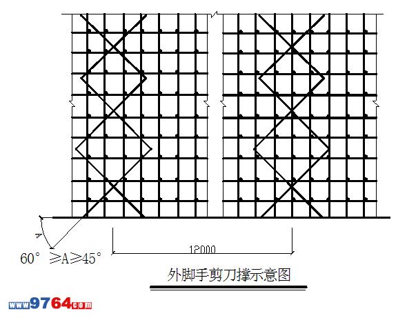 ②在外側(cè)立面的兩端各設(shè)置一道剪刀撐,并應(yīng)由底至頂連續(xù)設(shè)置,中間各道剪刀撐之間的凈距不應(yīng)大于15m。(如圖)