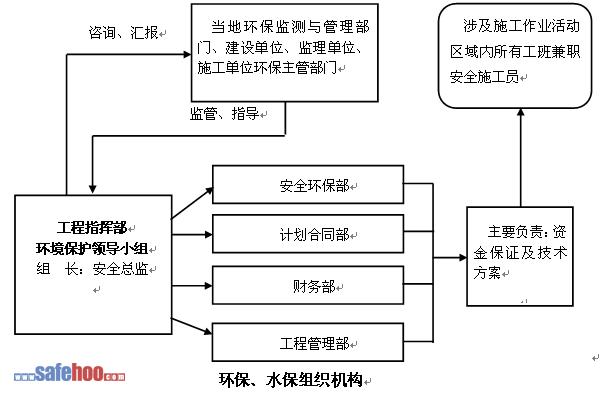 ⑵建立健全環(huán)境保護(hù)管理組織機(jī)構(gòu)和保證體系,建立健全環(huán)境保護(hù)管理組織機(jī)構(gòu),指揮部成立環(huán)保、水保領(lǐng)導(dǎo)小組,指揮部設(shè)立安全環(huán)保部,配專職環(huán)保、水保管理干部,各架子隊分級管理,并配專職管理人員,負(fù)責(zé)檢查、監(jiān)督各項(xiàng)環(huán)保水保工作的落實(shí)。環(huán)保水保組織機(jī)構(gòu)見環(huán)保、水保組織機(jī)構(gòu)圖。