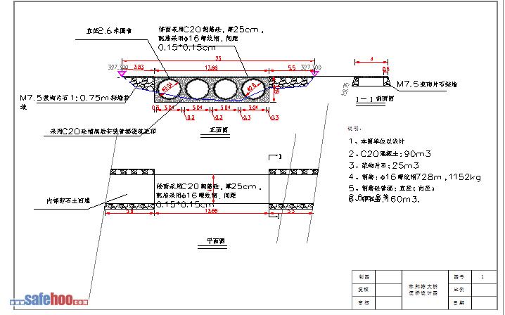 8#~9#墩管涵便橋共埋設(shè)內(nèi)徑150cm的管涵5組,每組均為2米涵管對接,橋?qū)?米。11#~12#墩管涵便橋共埋設(shè)內(nèi)徑260cm的管涵4組,每組均為2米涵管對接,橋?qū)?米。圓管接縫寬度為1cm,并用1:3的水泥砂漿抹帶,形成密封層。管涵之間用C20砼填筑。具體見圓管涵便橋設(shè)計圖。