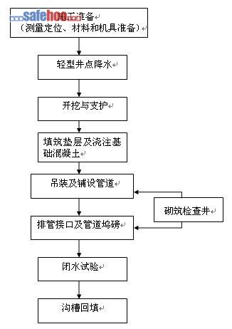 開挖施工過程中,除了處理好施工沿線排水外,還應(yīng)做好溝槽內(nèi)的明排水工作,溝槽內(nèi)的挖土可挖成階梯形,循序進(jìn)行。槽內(nèi)兩側(cè)寬20cm深20cm的排水溝,每節(jié)管道每側(cè)應(yīng)至少設(shè)兩個(gè)集水坑。在整個(gè)施工過程中,溝槽內(nèi)不得積水,嚴(yán)禁在水中作業(yè)。