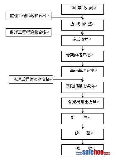 3、測(cè)量放樣:根據(jù)設(shè)計(jì)要求定出骨架基礎(chǔ)大樣,用挖掘機(jī)結(jié)合人工將基礎(chǔ)基坑開(kāi)挖好,按圖紙?jiān)O(shè)計(jì)平面位置、標(biāo)高及幾何尺寸進(jìn)行施工。