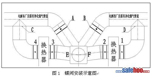 在原有凈化煙氣管道上安裝蝶閥的示意圖如上圖1所示,整個(gè)過(guò)程需在凈化變頻風(fēng)機(jī)開(kāi)啟40%左右的情況下完成,首先需完全關(guān)閉圖1中的1#、2#、3#和4#蝶閥,先由作業(yè)人員在佩戴防毒面具的情況下,通過(guò)管道人孔進(jìn)入換熱器管道,在圖1中的C、D、E、F處采用氣割的方式將原有凈化管道割開(kāi)一直徑為2960mm的圓,使得換熱器管道與原有凈化管道相連通,作業(yè)完畢后需封閉全部人孔,然后將圖1中的1#、2#、3#和4#蝶閥完全開(kāi)啟,這樣可在風(fēng)機(jī)開(kāi)啟40%左右的情況下,使煙氣經(jīng)換熱器管道進(jìn)入凈化除塵器,此時(shí)可在圖1中A、B處割開(kāi)一條φ2960-1000的缺口,最后將蝶閥吊運(yùn)到A、B口處,完成蝶閥的對(duì)接及焊接,這樣可以有效防止管道內(nèi)的煙氣向外泄露,影響整個(gè)安裝過(guò)程。