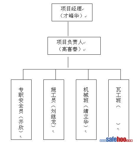 項目經(jīng)理為本工程施工的安全第一責(zé)任人,項目負(fù)責(zé)人為安全工作第一控制人,以下由專職安全員和班組兼職安全員形成本項目三級安全管理網(wǎng)絡(luò)。從上到下一級控制一級,從下到上一級向一級保證,明確各級安全職責(zé),切實把安全管理工作落實到實處。