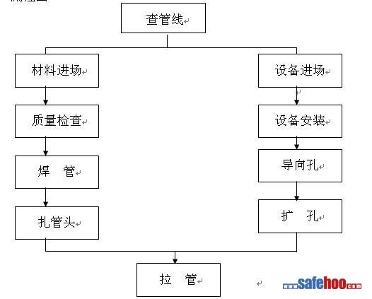 孔成后,在焊好的管子一端塞上木塞,打眼,穿上鋼絲繩,與拉管器連接,用鉆機(jī)從出土點(diǎn)拉向入土點(diǎn)。