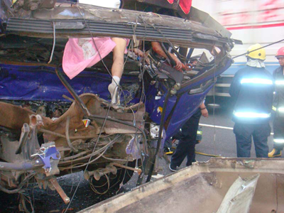 指揮員經(jīng)偵察,發(fā)現(xiàn)大貨車駕駛室已嚴(yán)重變形,原本寬近2米的駕駛室撞擊后已不到80厘米。當(dāng)時(shí)正在副駕駛室睡覺(jué)的李某因撞擊半個(gè)身體掛在貨車的擋風(fēng)玻璃框架上已當(dāng)場(chǎng)死亡,駕駛員的劉某被困車內(nèi)。消防官兵利用30分的時(shí)間成功營(yíng)救出被困的駕駛員劉某,并由120送往就近的醫(yī)院進(jìn)行救治。