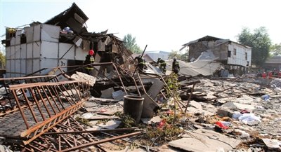 工人從未完全倒塌的宿舍內(nèi)轉(zhuǎn)運(yùn)物品。
