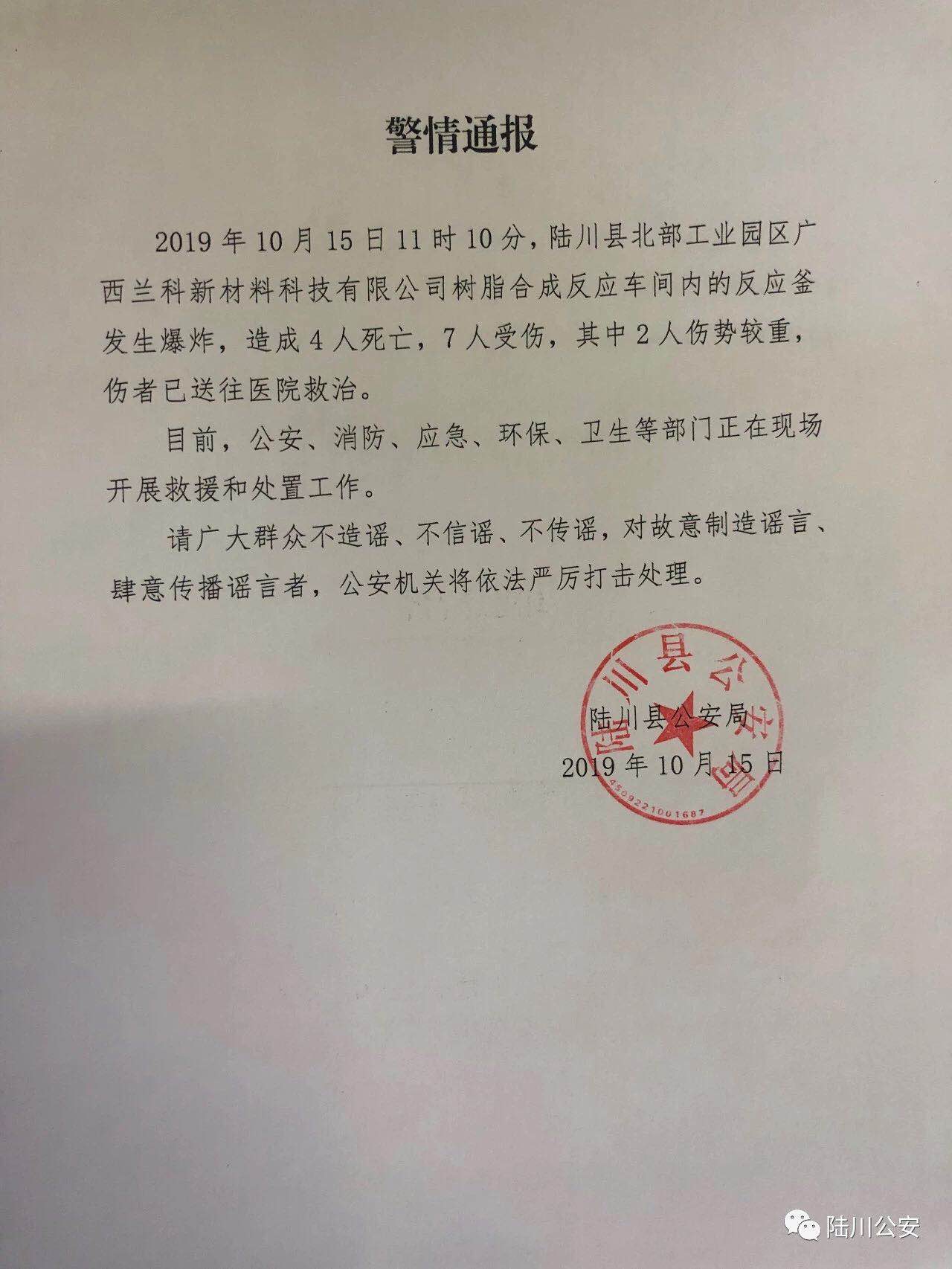 據(jù)廣西壯族自治區(qū)陸川縣公安局微信公眾號消息,10月15日11時(shí)許,廣西玉林陸川縣一化工廠樹脂合成反應(yīng)車間內(nèi)的反應(yīng)釜發(fā)生爆炸。目前,該事故已致4人死亡,7人受傷,其中2人傷勢較重。