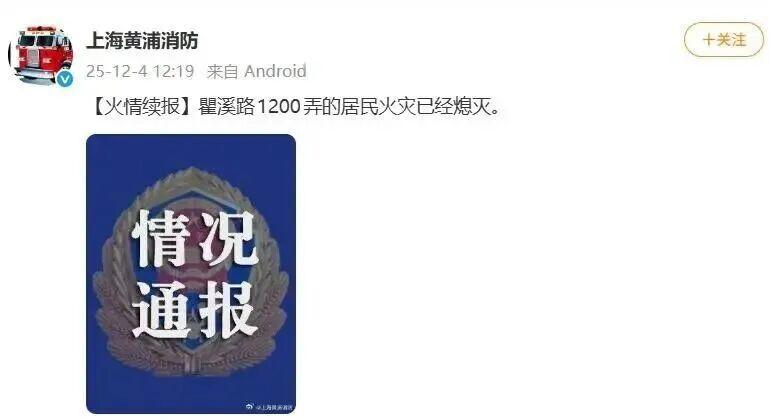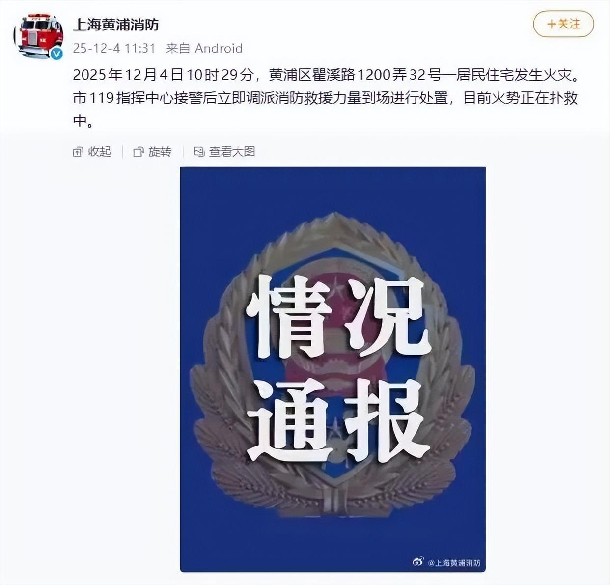 據(jù)@上海黃浦消防 11:31官方通報:2025年12月4日10時29分,黃浦區(qū)瞿溪路1200弄32號一居民住宅發(fā)生火災(zāi)。市119指揮中心接警后立即調(diào)派消防救援力量到場進行處置,目前火勢正在撲救中。