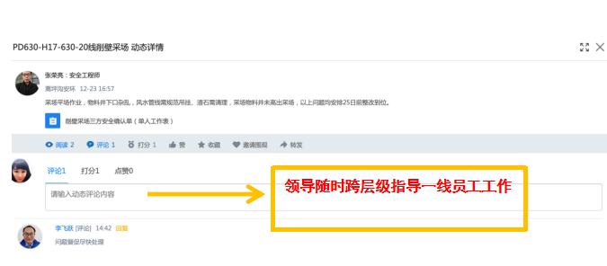 從一線作業(yè)面到業(yè)務(wù)監(jiān)管責(zé)任人,再到企業(yè)領(lǐng)導(dǎo),業(yè)務(wù)流程過程中的每一項,事事明系統(tǒng)內(nèi)都有真實留存。相關(guān)負責(zé)人需要查看業(yè)務(wù)流程中的任何一個過程都可以在事事明系統(tǒng)內(nèi)進行調(diào)取查看,同時,事事明還支持信息跨層級傳遞,上級領(lǐng)導(dǎo)通過事事明系統(tǒng),隨時可以指導(dǎo)一線員工工作內(nèi)容(如下圖),使上層領(lǐng)導(dǎo)的指導(dǎo)方案能迅速下達到一線員工,保證安全監(jiān)管落實的同時,提高企業(yè)的效能,實現(xiàn)企業(yè)降本增效。