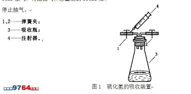 吸收裝置見圖1。用一個250ml錐形瓶作吸收瓶,向其加入50ml乙酸鋅溶液,用50ml或100ml注射器緊靠彈簧夾1的膠管刺入,多次抽取吸收瓶3中的空氣。每次抽抽出30ml~50ml空氣,待抽出氣體總量達到150ml后,停止抽氣。