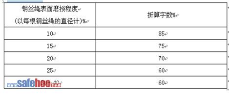 鋼絲繩均勻磨損時,隨磨損程度不均,報廢的標準斷絲數(shù),應(yīng)將上表所查得數(shù)字乘以下表所列折算字數(shù)。