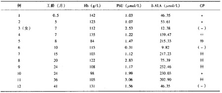 表1? 12名鉛作業(yè)工人Hb , PbU ,δ-ALA , CP檢測結(jié)果