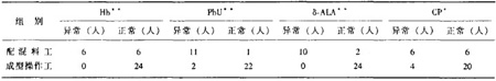 表2? 配混料工與成型操作工Hb , PbU , δ-ALA , CP異常檢出率比較