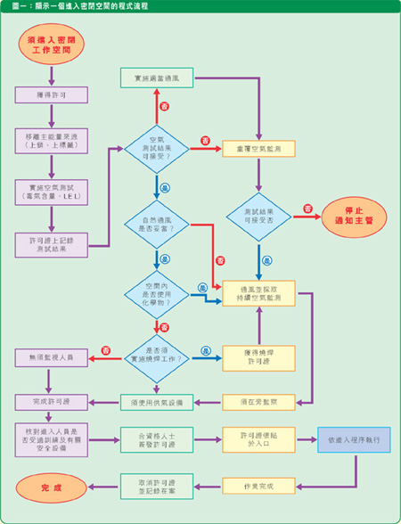 ——在工作之前,所有參與工作的工人及管理人員必需接受安全訓(xùn)練,提醒他們可能遇到的危險(xiǎn)或潛在危險(xiǎn);指導(dǎo)他們正確的操作程序(見圖一);需要的安全設(shè)備及執(zhí)行適當(dāng)?shù)木o急救援程序。