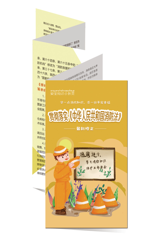 為方便安全生產(chǎn)宣傳活動,我們編制了系列安全生產(chǎn)折頁,內(nèi)容生動活潑,實用性強,內(nèi)容涵蓋面廣,為您普及日常生產(chǎn)與生活中的安全知識。本套折頁與掛圖形式結(jié)合,使安全教育更加到位,彌補安全宣教掛圖和圖書教材的不足,形式新穎,喜聞樂見,便于安全宣教活動發(fā)放,內(nèi)容新,符合國家最新法律法規(guī)和標(biāo)準(zhǔn),具有可讀性,從業(yè)人員一看便懂一看便會,宣教效果立竿見影。