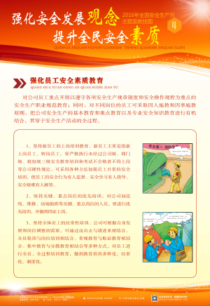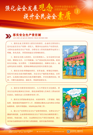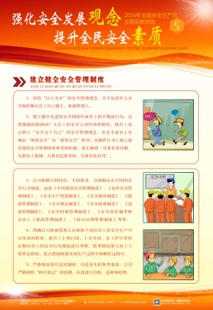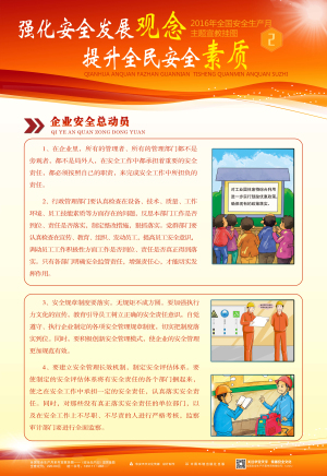 本套掛圖將國家安監(jiān)總局倡導(dǎo)的2016安全月主題“強化安全發(fā)展觀念,提升全民安全素質(zhì)”這一理念凝結(jié)成精煉的語言,溫馨的畫面,主題突出、層層遞進,從而加深對安全發(fā)展的體會和理解。具有營造安全生產(chǎn)月氣氛、增強員工安全意識、促進安全生產(chǎn)的作用。適合公共場所、工礦企事業(yè)單位開展安全生產(chǎn)月宣傳教育活動張貼。