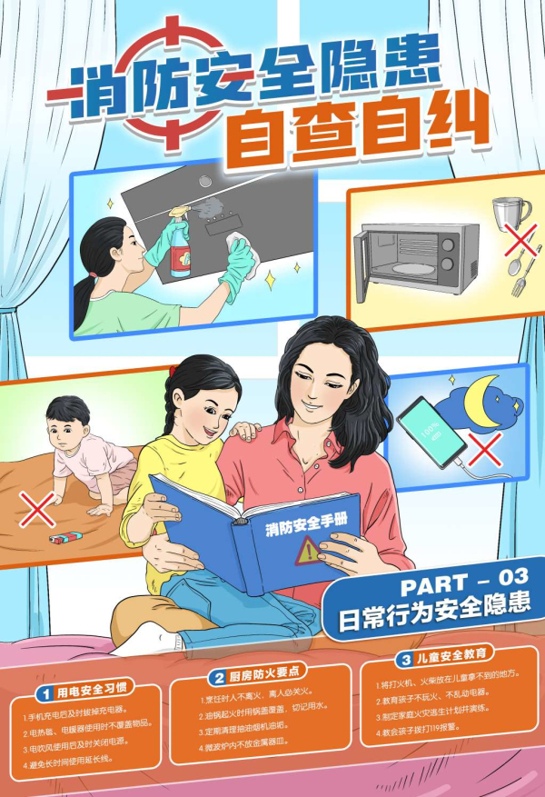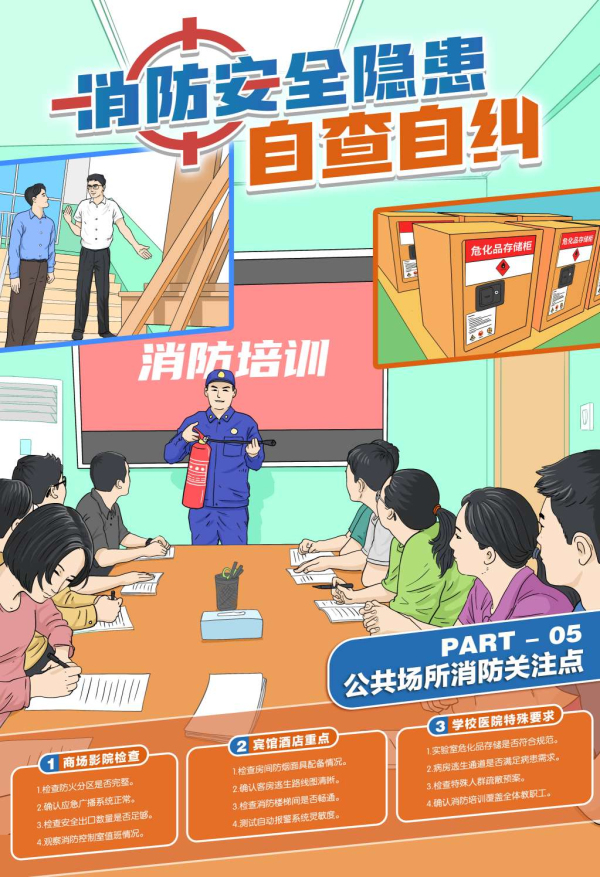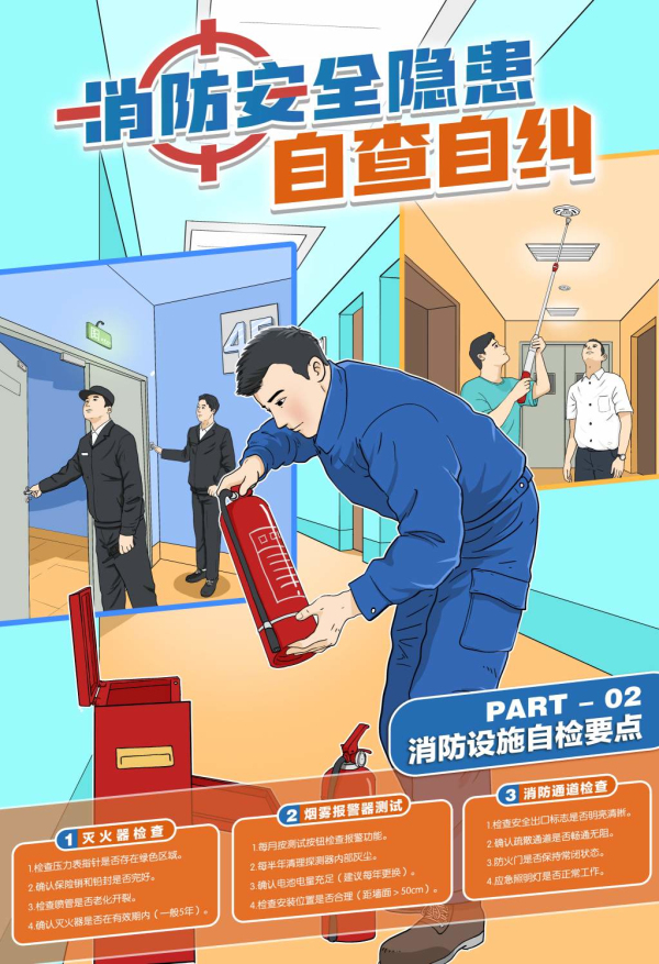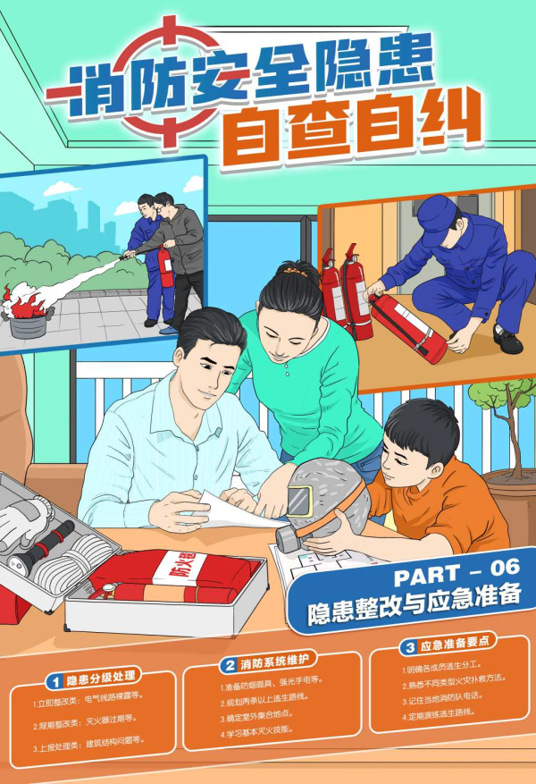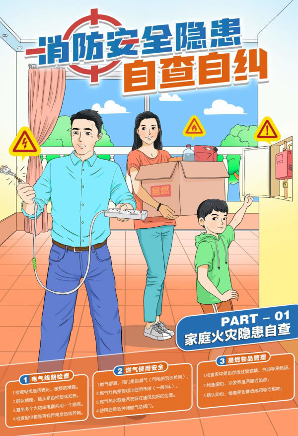 消防安全隱患自查自糾是主動防范火災、從源頭化解風險的關(guān)鍵手段,通過系統(tǒng)性排查與整改,可最大限度降低火災發(fā)生概率、減少災害損失。為提升全民消防安全意識、增強隱患排查能力而精心設(shè)計的宣傳掛圖,以直觀圖像和簡潔文字,助力各單位、場所和個人開展消防安全隱患自我排查與整改,切實筑牢消防安全屏障。