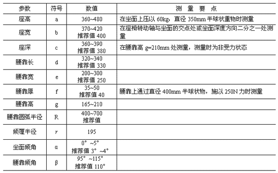 ?、诒碇兴袇?shù)a、f、g、α、β為操作者坐在椅上之后形成的尺寸、角度。測量時應(yīng)使用規(guī)定參數(shù)的重物代替坐姿狀態(tài)的人。