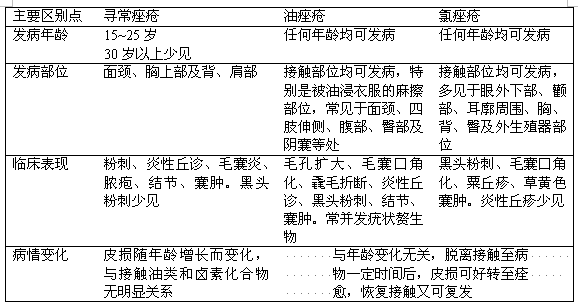 B5 診斷職業(yè)性痤瘡主要應(yīng)與尋常痤瘡鑒別。尋常痤瘡有其固定的好發(fā)部位(面頸、胸、背、肩)及好發(fā)年齡(15~25歲),而職業(yè)性痤瘡可發(fā)生于任何年齡和任何接觸部位,這些鑒別診斷上具有重要意義。對(duì)青年工人在工作中發(fā)生的痤瘡,如皮損只限于面部,則鑒別其是職業(yè)性痤瘡還是尋常痤瘡有一定困難;若四肢、陰囊等同時(shí)有皮損,則可明確診斷為職業(yè)性痤瘡。