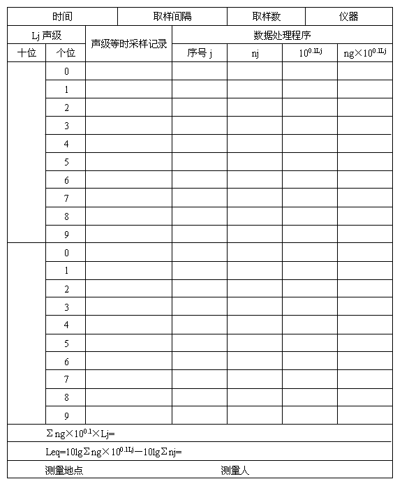 1. 一般對(duì)于無(wú)規(guī)噪聲的等效聲級(jí)測(cè)量,應(yīng)按等時(shí)采樣的方法,在典型生產(chǎn)過(guò)程中使用聲級(jí)計(jì)慢檔每隔5秒鐘讀取一個(gè)瞬時(shí)A聲級(jí),連續(xù)取100個(gè)數(shù)據(jù),記入附表2.1;并按附表2.1所列程序處理數(shù)據(jù)。