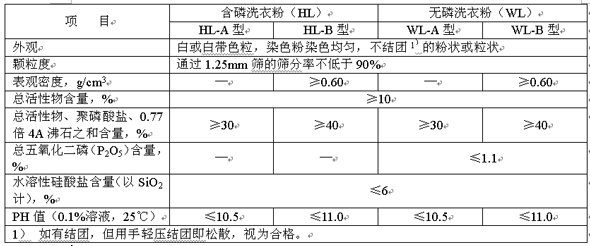 各類(lèi)型洗衣粉的理化性能應(yīng)符合表1的規(guī)定。