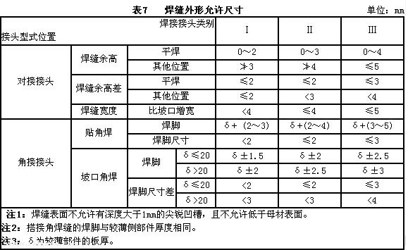 7.1.1焊縫邊緣應(yīng)圓滑過(guò)渡到母材,焊縫外形尺寸應(yīng)符合設(shè)計(jì)要求,其允許尺寸見表7。