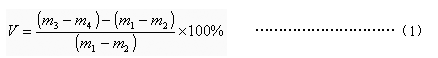 每個試片在空氣中稱重(m1),然后將試片放入盛有已知量蒸餾水的玻璃瓶中,稱試片在蒸餾水中的質(zhì)量(m2),應確保除去全部氣泡,稱重精確到毫克。取出試片用濾紙或不帶絨的織物吸干試片上的水分,每個試片分別放入裝有試液的有蓋玻璃容器中,試液應保持試片完全浸沒。如果試片的密度低于試液的密度,要用工具使試片完全處于液面之下。容器要蓋緊,避光,放在20℃±2℃的環(huán)境下,22h±0.25h后取出試片,用濾紙或不帶絨的紡織物將試片上殘留的試液擦干。然后把每個試片立刻放入帶蓋已稱過皮重的瓶子里,并在空氣中稱其質(zhì)量(m3),精確到毫克。再從瓶中取出試片立刻放入已稱過皮重帶蓋盛有蒸餾水的瓶子里,稱其在蒸餾水中的質(zhì)量(m4)。從試液中取出試片,每次轉(zhuǎn)移時間不得超過30s,體積變化按式(1)計算: