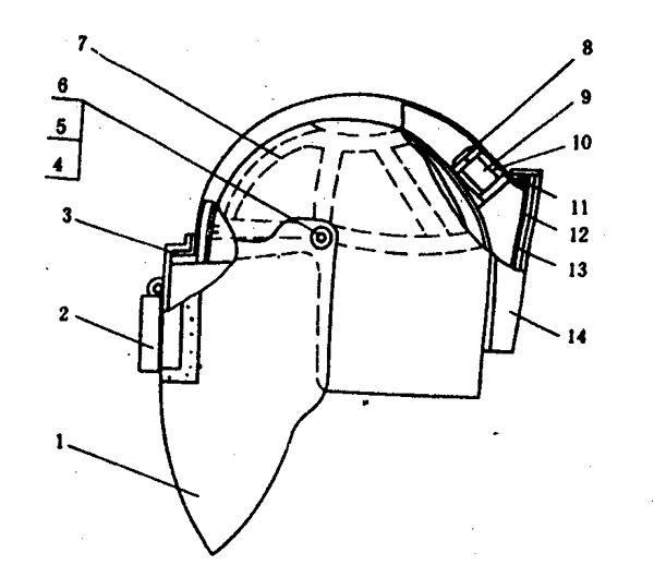 1―面罩;2―目鏡;3―帽殼;4―風機;5―過濾器;6―電池