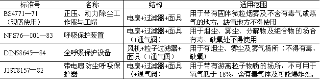 表1 英、法、西德、日本電動送風防塵面具標準