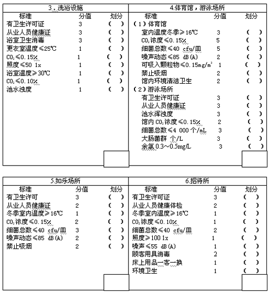 教室人均面積、課桌椅、黑板、教室采光、教室照明、微小氣候、噪聲、廁所、生活飲用水、學校食品衛(wèi)生、傳染病管理、圖書館、學生宿舍、洗浴設(shè)施、體育館、旅游場所、招待所、娛樂場所。