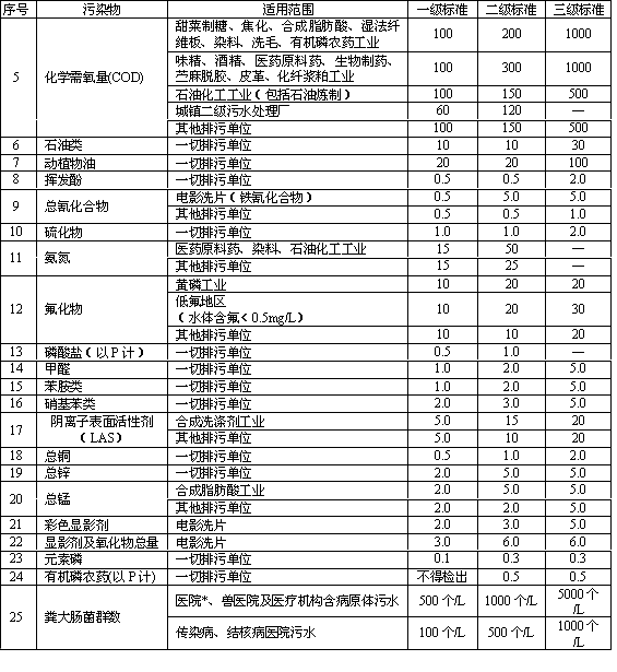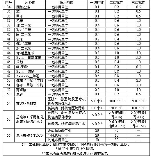 本標(biāo)準(zhǔn)按照污水排放去向,分年限規(guī)定了69種水污染物最高允許排放濃度及部分待業(yè)最高允許排水量。