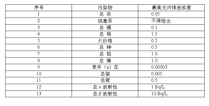 表1 第一類污染物最高允許排放濃度 mg/L