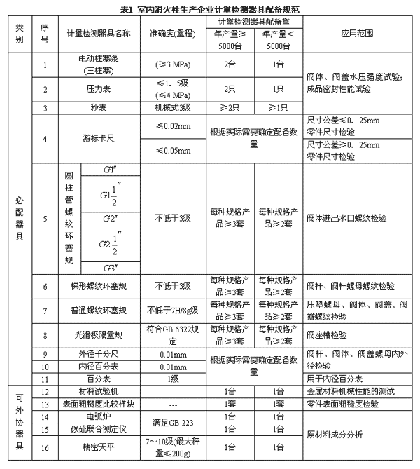 4.1 室內(nèi)消火栓生產(chǎn)企業(yè)計(jì)量檢測(cè)器具配備規(guī)范見(jiàn)表1。