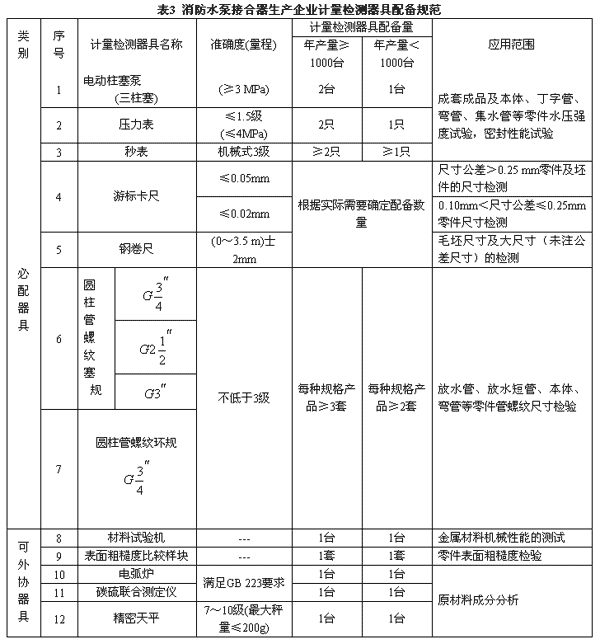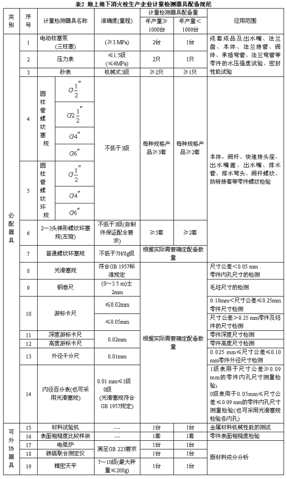 3.1 本標(biāo)準(zhǔn)所規(guī)定計(jì)量檢測(cè)器具配備量為一班制生產(chǎn)企業(yè)的最低配備量,其中室內(nèi)消火栓年產(chǎn)量超過(guò)1萬(wàn)臺(tái)的企業(yè),其配備量應(yīng)適當(dāng)增加;地上地下消火栓、水泵接合器、消火栓連接器超過(guò)2千臺(tái)的企業(yè),其配備量應(yīng)適當(dāng)增加;消防接口超過(guò)2萬(wàn)件的企業(yè),其配備量應(yīng)適當(dāng)增加。