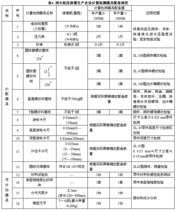 4.4 消火栓連接器生產(chǎn)企業(yè)計(jì)量檢測(cè)器具配備規(guī)范見(jiàn)表4。