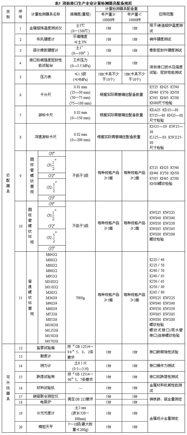 4.5 消防接口生產(chǎn)企業(yè)計(jì)量檢測(cè)器具配備規(guī)范見(jiàn)表5。