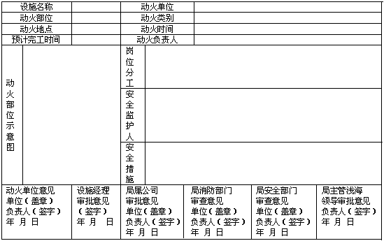 5.2 0類動火申請報告由局屬公司按附錄A(標(biāo)準(zhǔn)的附錄)的要求填好后,經(jīng)局安全、消防部門審查后再報局主管淺海的領(lǐng)導(dǎo)或其授權(quán)人員批準(zhǔn)。