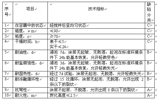 出廠檢驗(yàn)項(xiàng)目為在容器中的狀態(tài)、細(xì)度、粘度、干燥時(shí)間、抗彎性、耐油性和耐鹽性七項(xiàng)。