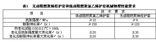 5.7.2.4 無鹵阻燃聚烯烴護(hù)套和低鹵阻燃聚氯乙烯護(hù)套的機(jī)械物理性能要求應(yīng)符合表1規(guī)定。