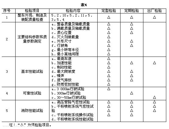 干粉車的定型檢驗(yàn),定期檢驗(yàn)及出廠檢驗(yàn)項(xiàng)目及內(nèi)容按表4的規(guī)定。