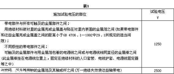 b)電氣強(qiáng)度試驗(yàn)歷時(shí)1min,經(jīng)受頻率為50Hz的基本正弦波的交流電壓,其試驗(yàn)電壓值和試驗(yàn)部位按表1規(guī)定。