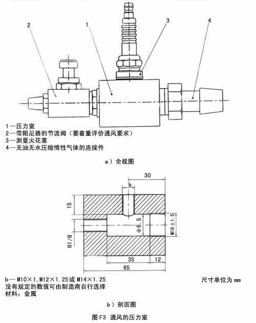 通過(guò)調(diào)節(jié)壓力室中的惰性氣體壓力,將在點(diǎn)火線圈輸出端被測(cè)量的峰值電壓設(shè)定到10 kV,脈沖幅度應(yīng)盡可能穩(wěn)定,脈沖頻率應(yīng)為50 Hz。如果在本附錄F5中沒(méi)有規(guī)定其他數(shù)值,測(cè)量距離a應(yīng)為150 mm。