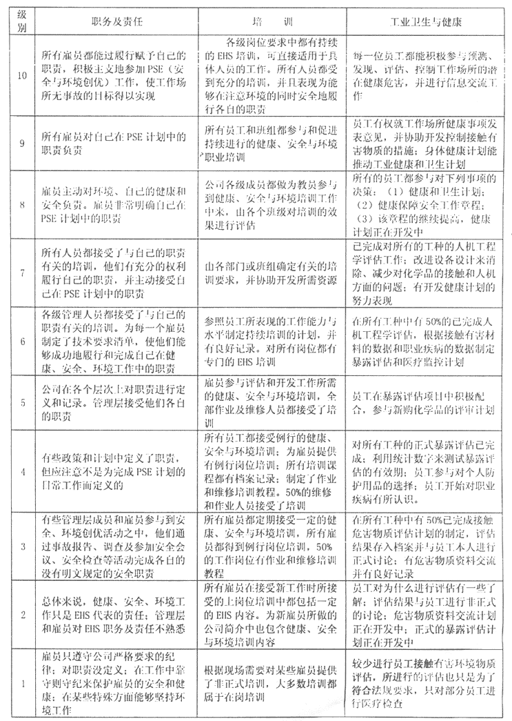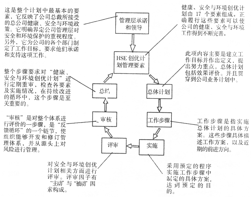 健康、安全、環(huán)境創(chuàng)優(yōu)計劃包括17個要素。這些要不是使公司在健康、安全與環(huán)境方面保持先進水平的管理目標,它們構成了總體計劃的三個大組成部分:人員、設備和體系。這17個要素對菲利普斯健康、安全與環(huán)境努力提供了一個框架,允許各分支機構概據(jù)他們各類具體作業(yè)危險的嚴重程度靈活掌握,把握努力方向,改進工作。對每個要素在各層次上都進行了定義,以便各單位用來評估他們的工作進展情況。