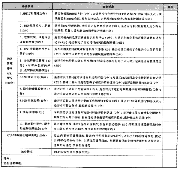資格預(yù)審主要是對(duì)于承包商的施工資格和安全資格進(jìn)行審核和確認(rèn),分別由機(jī)動(dòng)部門(項(xiàng)目管理是部門)和安全環(huán)保部門來進(jìn)行。機(jī)動(dòng)部門收集有關(guān)承包商的資質(zhì)證書、工商行政營業(yè)執(zhí)照、安裝許可證、檢修安裝業(yè)績等資料后,對(duì)承包商的經(jīng)營范圍、施工管理能力、工機(jī)具、隊(duì)伍素質(zhì)進(jìn)行審核,合格后頒發(fā)《工程項(xiàng)目施工資格確認(rèn)證書》。承包商在取得機(jī)動(dòng)部門核發(fā)施工資格確認(rèn)證書后,向安全環(huán)保部門提交有關(guān)材料,安全環(huán)保部門確認(rèn)其安全資格。在實(shí)際工作中,我們把承包商安全資格的確認(rèn)同承包商安全信譽(yù)等級(jí)結(jié)合起來進(jìn)行量化評(píng)價(jià),把承包商的安全信譽(yù)等級(jí)分5級(jí),其中得分為180~200分的為5S級(jí),160~179分的為4S級(jí),140~159分的為3S級(jí),120~139分的為2S級(jí),119分以下的為1S級(jí)。5S級(jí)為安全信譽(yù)等級(jí)最高,IS級(jí)為安全信譽(yù)等級(jí)最低。安全信譽(yù)等級(jí)達(dá)到3S級(jí)及其以上的為合格,可辦理《工程項(xiàng)目安全資格確認(rèn)證書》。3S級(jí)以下的為不合格,不予辦理安全資格確認(rèn)證書。確定安全信譽(yù)等級(jí)的依據(jù)是承包商HSE管理體系的建立和執(zhí)行事故情況;過去2年內(nèi)的HSE業(yè)績;在企業(yè)內(nèi)的違章及事故情況。承包商出現(xiàn)違章的事故時(shí),按性質(zhì)的不同分別扣除不同的分值,若承包商在1年內(nèi)未發(fā)生任何事故,在評(píng)價(jià)發(fā)全信譽(yù)等級(jí)時(shí)可加分。承包商安全信譽(yù)等級(jí)評(píng)價(jià)的具體內(nèi)容和標(biāo)準(zhǔn)見表1。