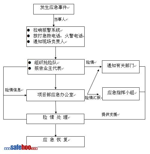 ??????? 施工現(xiàn)場設(shè)應(yīng)急指揮領(lǐng)導(dǎo)小組,下設(shè)應(yīng)急辦公室,負責(zé)組織編制施工現(xiàn)場的應(yīng)急計劃,明確發(fā)生事故險情時的處理方案、人員分工、設(shè)備運行等內(nèi)容,保證所有的應(yīng)急設(shè)備、設(shè)施完好有效,并組織職工的培訓(xùn)和應(yīng)急演練,使應(yīng)急人員能夠熟練掌握。事故發(fā)生時,按下圖啟動應(yīng)急預(yù)案。
