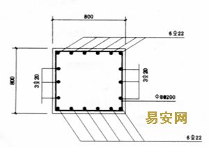 4.1.3支撐梁斷面采用700×800、800×800,梁底標(biāo)高-5.05m,梁頂標(biāo)高-4.250m,配筋為12ф22+6ф20,ф8@200(見圖4)。