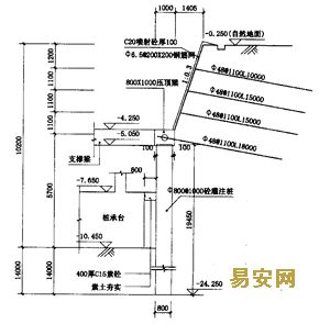 4.3.2壓頂梁斷面1000×800,內(nèi)配16ф25+ф16、ф8@200。土釘墻的最下一排錨桿應(yīng)錨入混凝土壓頂梁內(nèi)。