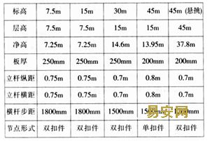 樓層板底支撐常規(guī)高支模滿堂腳手架設(shè)置。其不同樓層板底模板支撐間距見表1。
